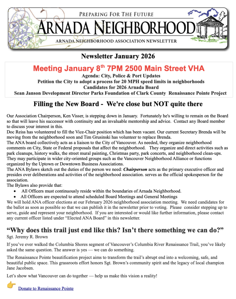 The Arnada Neighborhood Association (ANA) newsletter is published monthly to keep our community informed and connected. Nearly 2,000 copies are distributed to homes, local businesses, and gathering spots between Fourth Plain and McLoughlin, from Main Street to I-5. Residents and friends who subscribe by email also receive the newsletter digitally, making it easy to stay up to date wherever you are. Browse the recent editions below to catch up on neighborhood news, events, and opportunities to get involved.